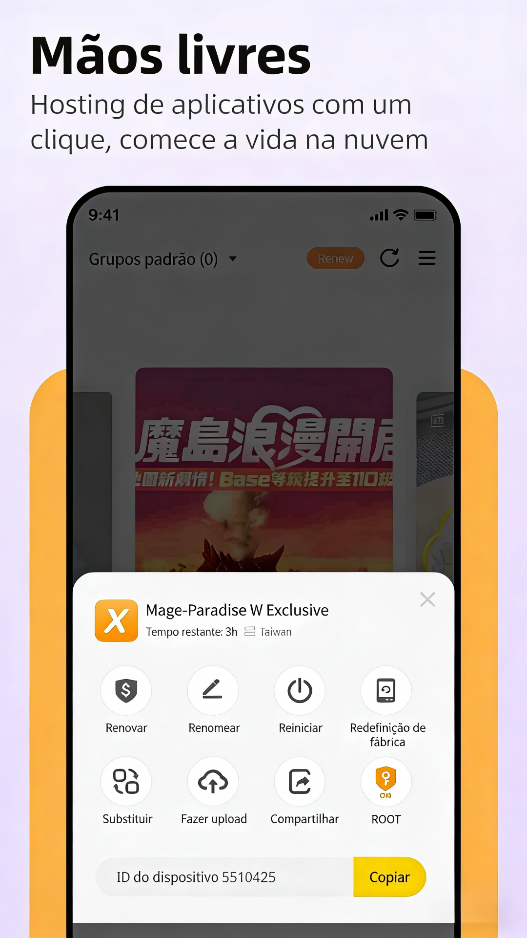 Telefone Android de alto desempenho totalmente na nuvem. Nenhum uso de armazenamento, CPU ou bateria local, liberando recursos do seu dispositivo e garantindo melhor desempenho. Acesse em Windows, Android, macOS e iOS, a qualquer hora e em qualquer lugar.
