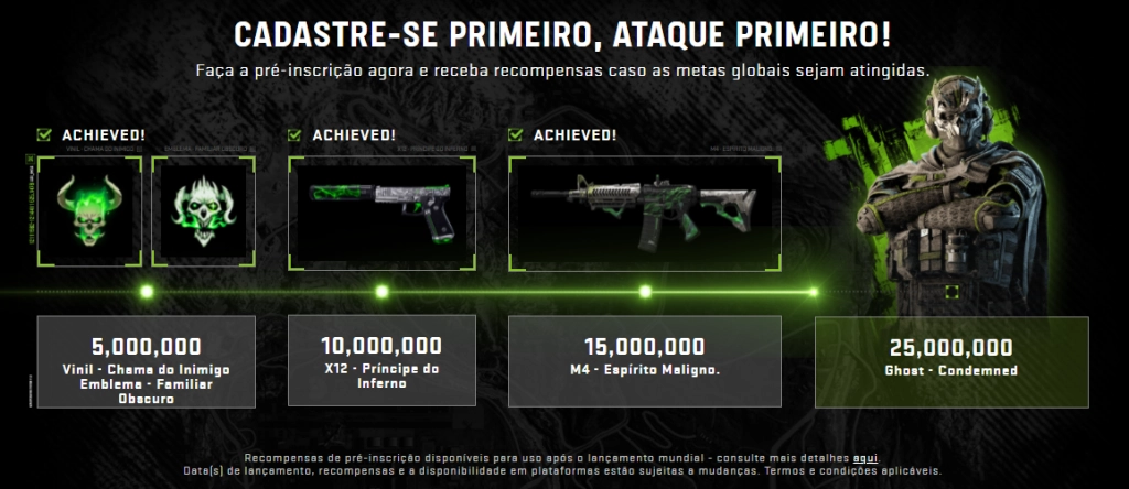 No site oficial de Call of Duty: Warzone Mobile, podemos ver a meta com a lista de itens disponíveis caso os jogadores atingirem os níveis. Felizmente, todos os objetivos foram batidos, e os que se registrarem poderão ganhar: X12 - Príncipe do Inferno; Vinil - Chama do Inimigo e Emblema - Familiar Obscuro; e Ghost - Condenado.