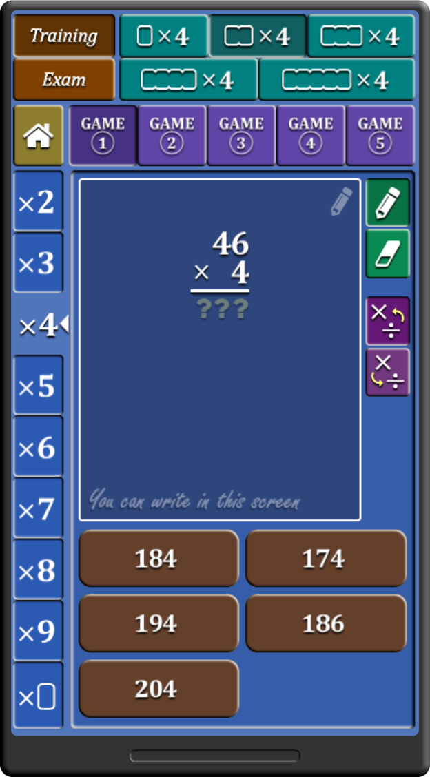 - você escolherá entre duas formas de trabalho: treino ou exame. Isso significa escolher entre um treino de multiplicação rápido e sem estresse ou um teste de dez questões para verificar seus conhecimentos por meio da nota final.